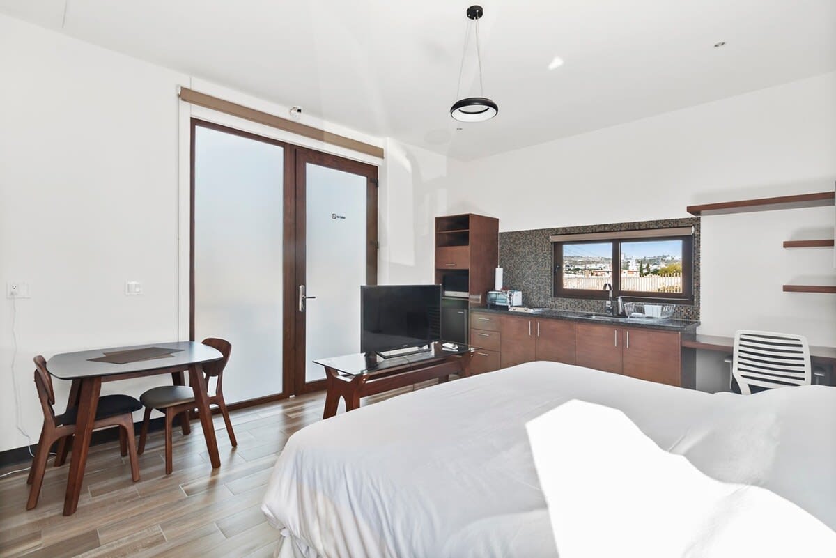 Si buscas un lugar que se parezca a un hogar/casa, este es el indicado. Puedes encontrar desde utensilios, electrodomésticos básicos, frigobar con suficiente espacio incluso para congelados, muy limpio y de clase. El aire acondicionado a la perfección. Tú entrada es totalmente independiente solo cuando te dan tu tarjeta de acceso en caseta para tu check in y cuando la dejas en tu check out, de ahí en mas todas las entradas son eléctricas, incluso tu puerta de habitación. El estacionamiento súper cómodo y muy seguro. La ubicación es excelente, el centro lo tienes a 5 min en coche. Si vas a viajar solo o en pareja este lugar es perfecto, para vacacionar o de trabajo. Volveré sin duda.