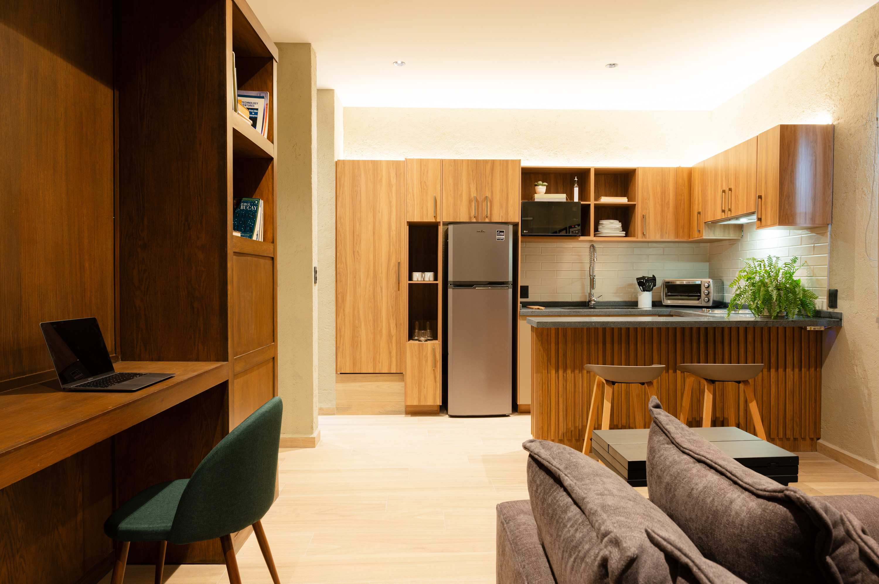 The area was convenient and walkable to the Centro. There's 2 Oxxo markets within a 2/3 block walk away. Not bad when you have to carry home a jug of water or get some basics. The bar stool was wobbly when I got there and since there was limited table seating, I sat on it anyway. The stool broke immediately. The cleaning lady collected it but they did not replace the broken chair. With such a small space every piece of furniture counts. I wish they'd replaced the chair and inspected it prior to renting the unit. Also, the desk chair was not comfortable for all day work. My husband had a stiff neck from working at the desk all day for 4 days. For remote workers, I wish they invested in a real ergonomic desk chair. It seems a small expense for the rate of return it would net. They asked that you fill out a form off platform before getting access codes. I filled out my form 2 hrs in advance and still had to wait outside for a code. 30min response but still frustrating with luggage.