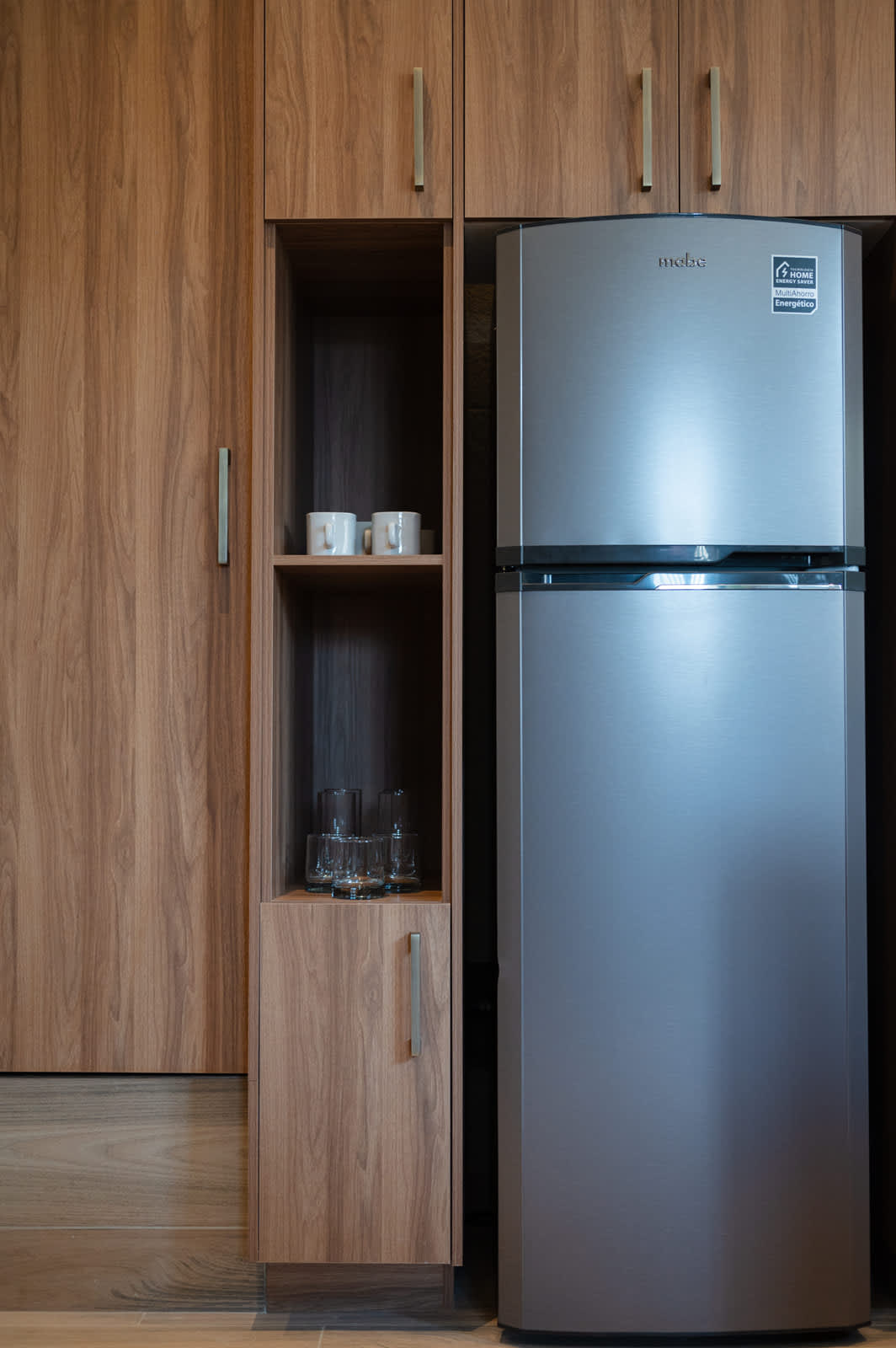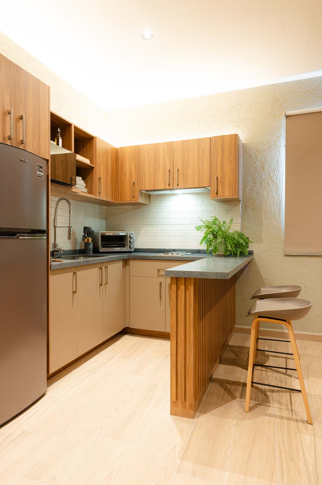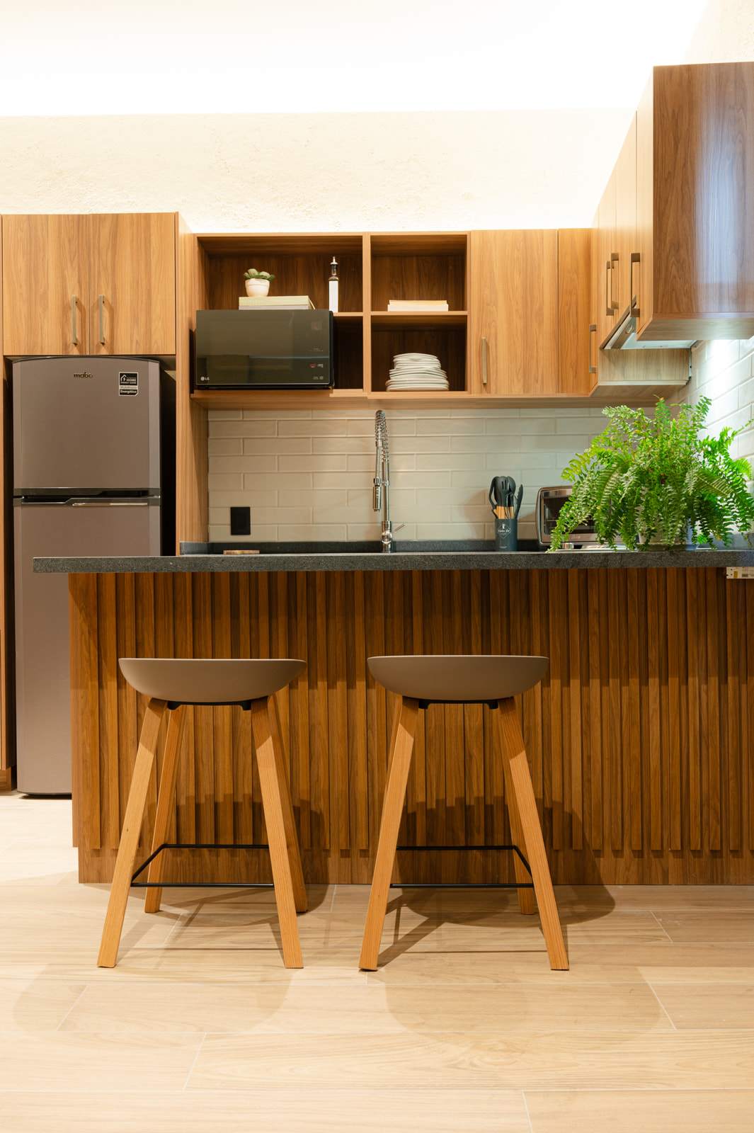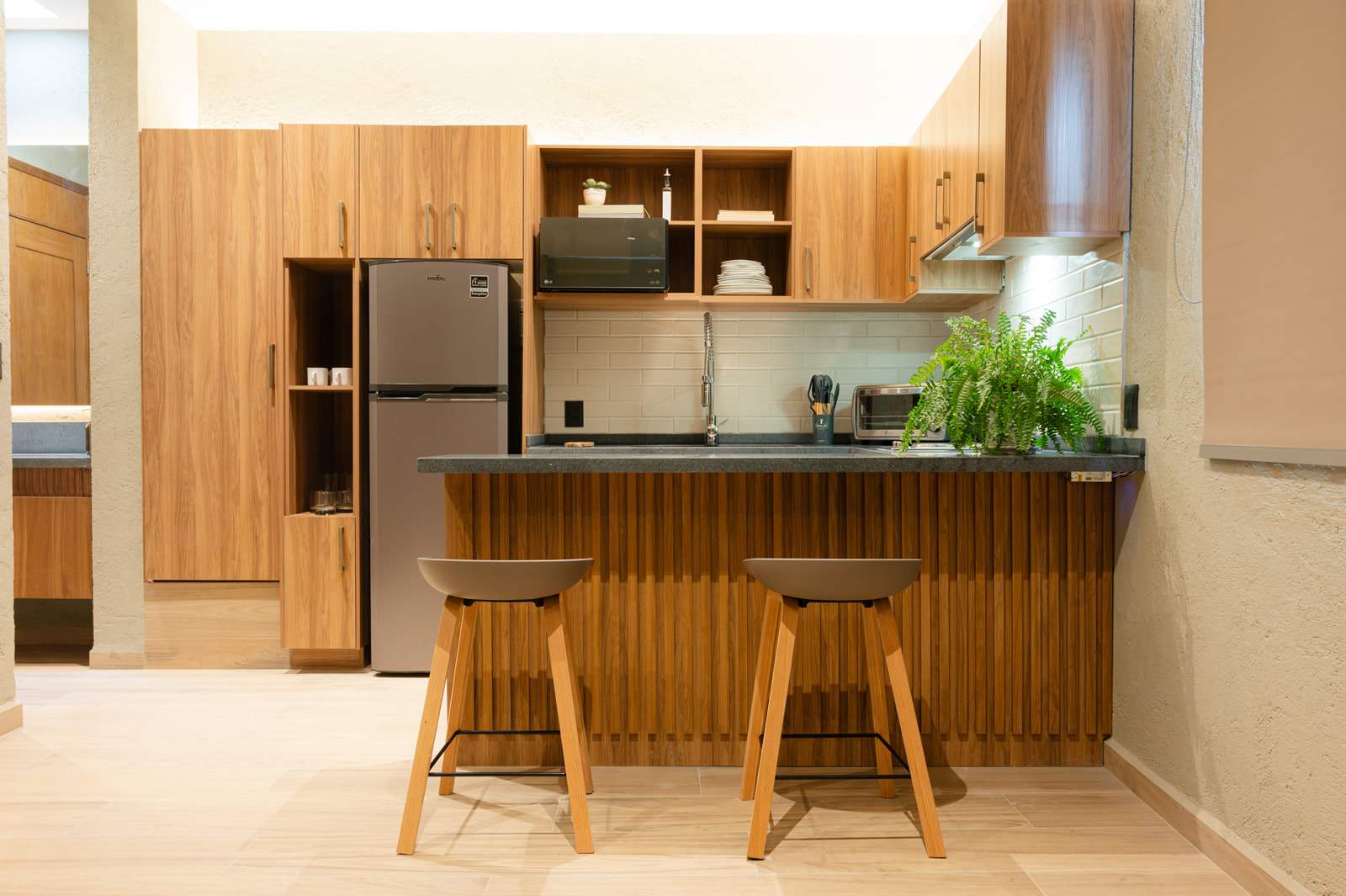 La cocina está muy bien equipada, aunque en nuestro caso solo usamos el refri y la barra para cenar comida de fuera. Aun así, se nota que tiene todo lo necesario para estancias más largas.