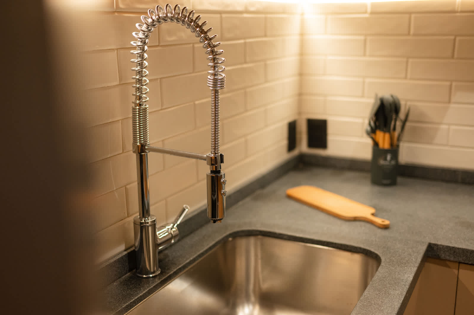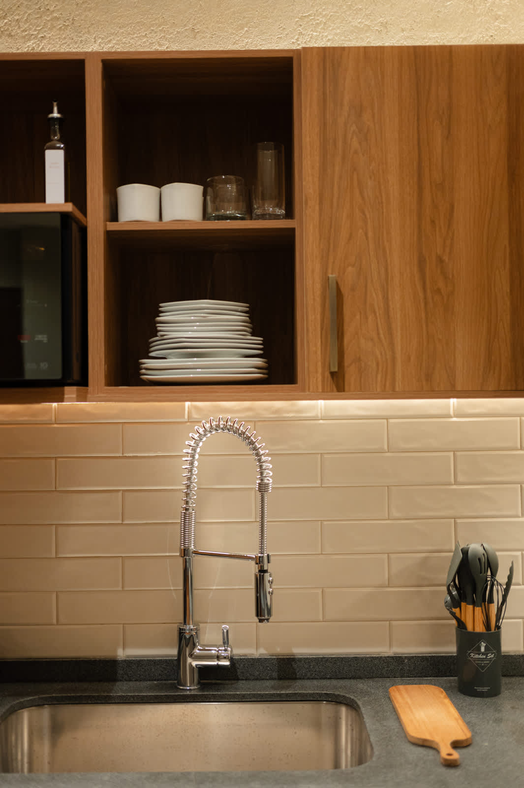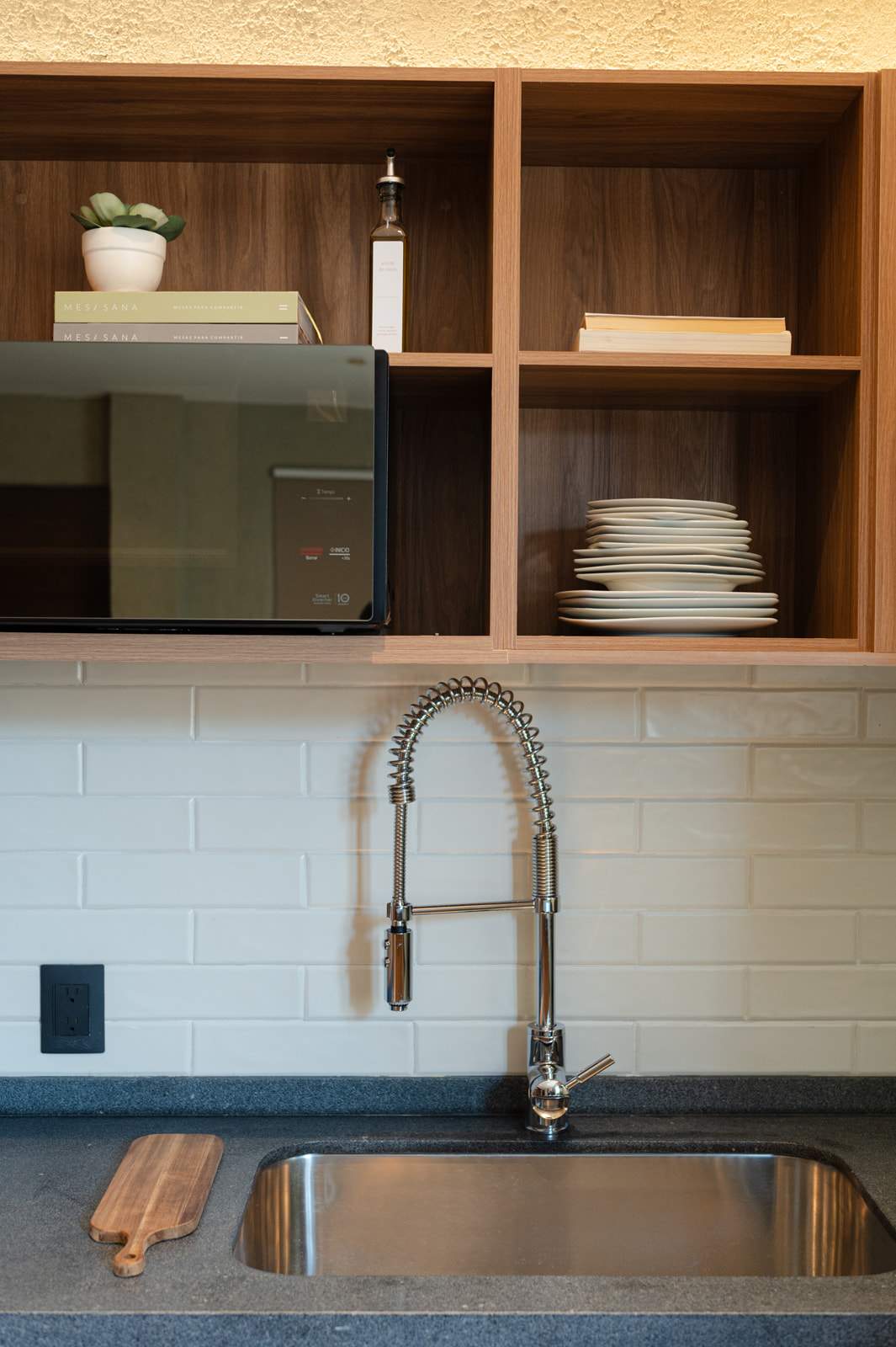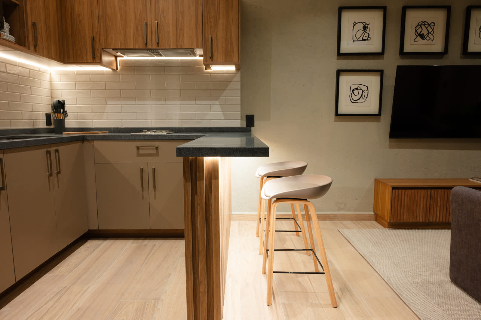 La cocina está muy bien equipada, aunque en nuestro caso solo usamos el refri y la barra para cenar comida de fuera. Aun así, se nota que tiene todo lo necesario para estancias más largas.