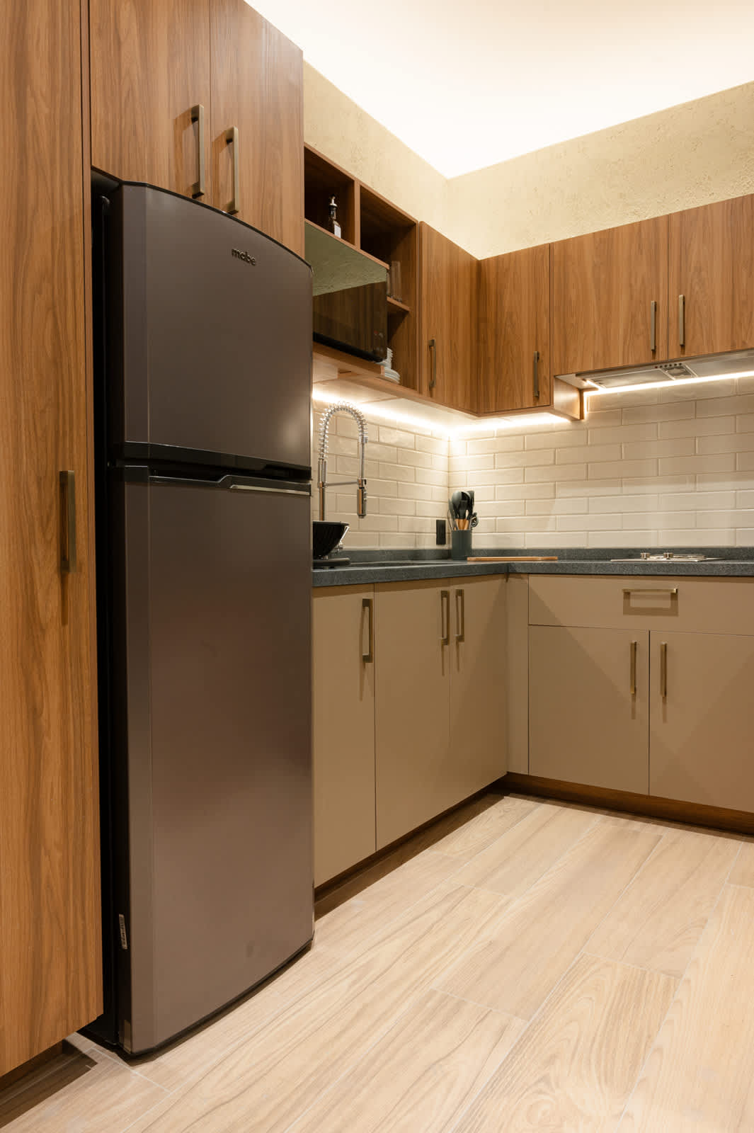 bien limpio y ordenado con todo , trastes , refrigerador, cuchillos , licuadora, señora de la limpieza bien atenta, hasta dos botellitas de agua de cortesía en el refrigerador todo genial